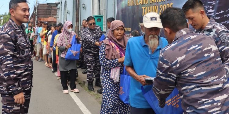 INformasinasional.com,Tegal– Dalam rangka menyambut Hari Ulang Tahun ke-80 Tentara Nasional Indonesia tahun 2025, Pangkalan TNI Angkatan Laut (Lanal) Tegal menggelar kegiatan bakti sosial berupa pembagian paket sembako dan nasi kotak kepada masyarakat. Kegiatan dilaksanakan di depan Mako Lanal Tegal, Jl. Proklamasi No.1 Kota Tegal,Jum,at ( 19/9).