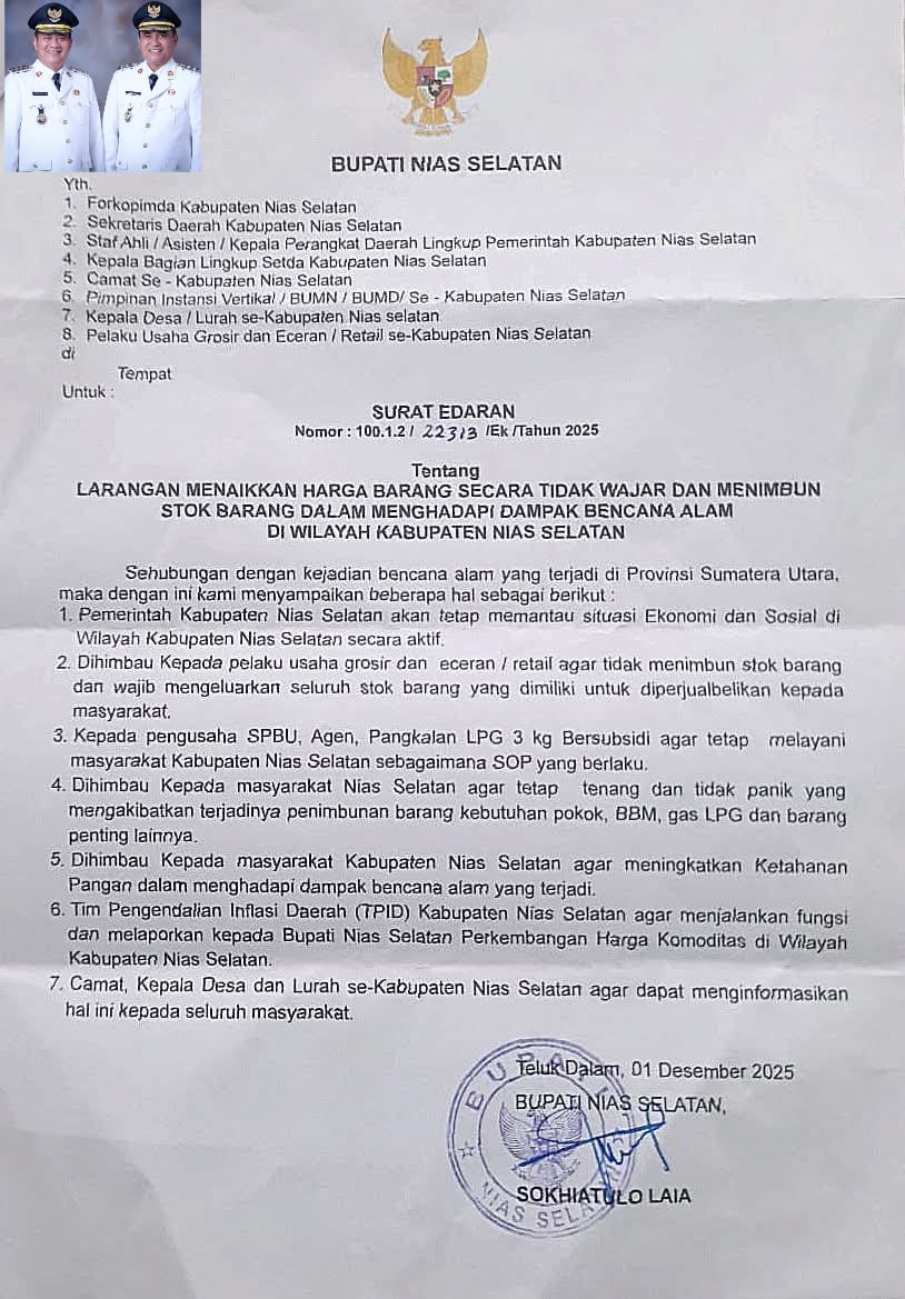 INformasinasional.com, Nias Selatan — Ditengah kepungan bencana yang menyisakan lumpur dan kepanikan dibanyak desa, Pemerintah Kabupaten Nias Barat menghunus kebijakan baru yang tajam bak belati. Selembar surat edaran resmi diteken dan diumumkan, Rabu (03/12/2025), isinya, larangan keras menaikkan harga kebutuhan pokok secara liar dan menimbun barang untuk meraup keuntungan sesaat.