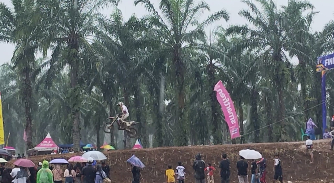 Tidak hanya pembalap, antusiasme penonton juga tetap tinggi. Mereka bertahan di sekitar sirkuit meski harus diguyur hujan deras untuk menyaksikan langsung jalannya perlombaan.