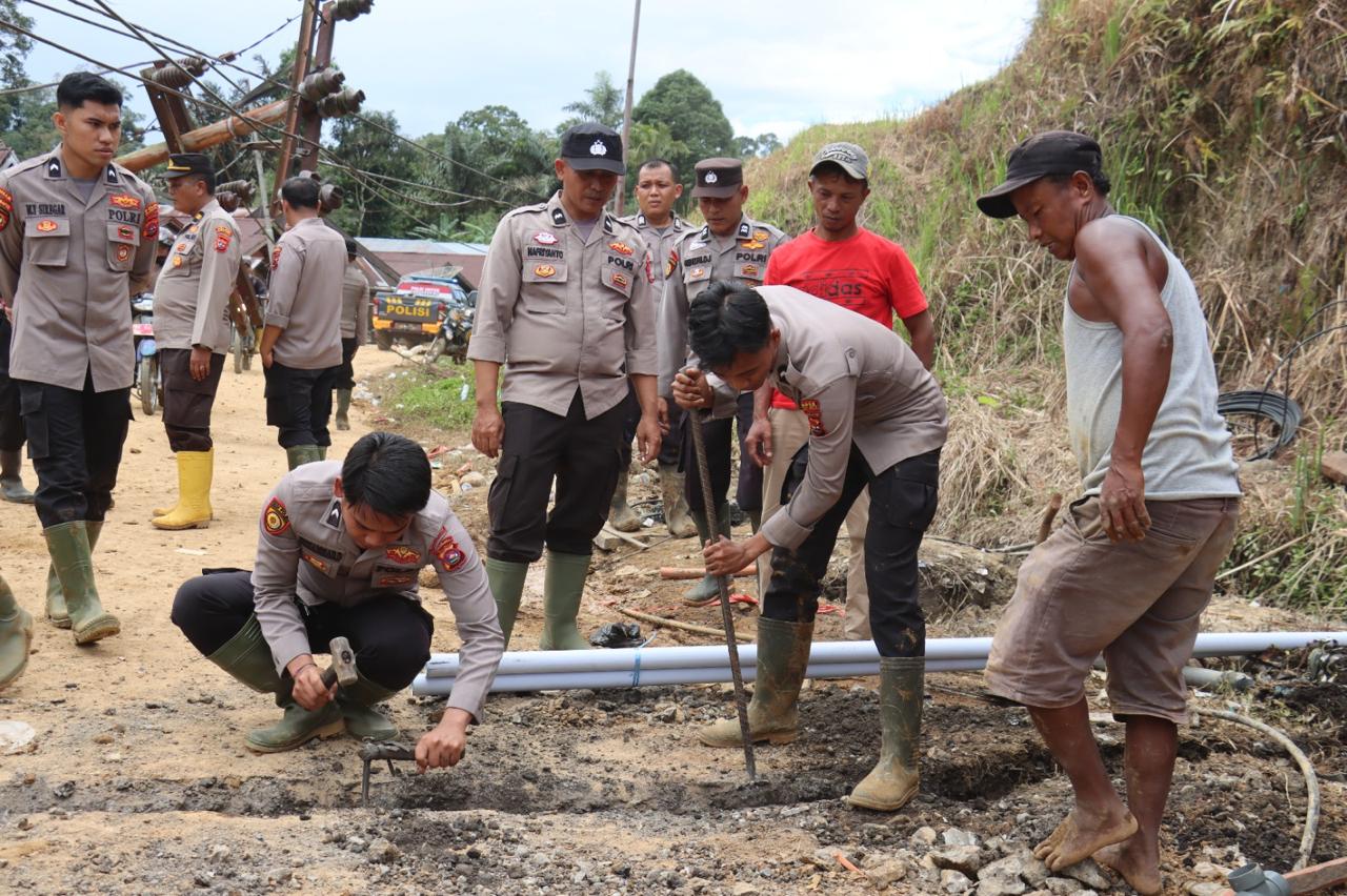 Terlihat Personel kepolisian bersama masyarakat setempat bergotong royong memperbaiki jalur penyaluran air bersih secara swadaya.
