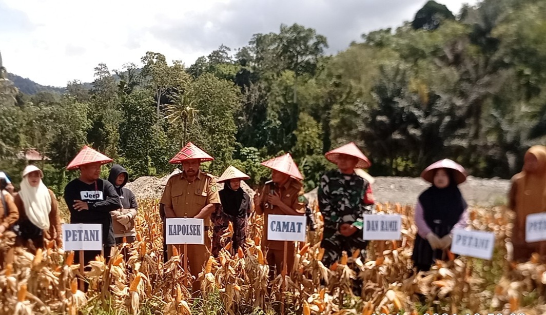 INformasinasional.com.Madina. Ketua Kelompok Tani Saroha, Maraginda Hakim Nasution bersama Camat Kotanopan, Enda Mora, Kopolsek Kotanopan, Danramil Kotanopan serta Penyuluh Pertanian Lapangan Kotanopan melakukan panen jagung ke 4 di areal reklamasi pertambangan Saba Arambir Desa Jambur Tarung Kecamatan Kotanopan Kabupaten Mandailing Natal, Selasa (14/4/2026).