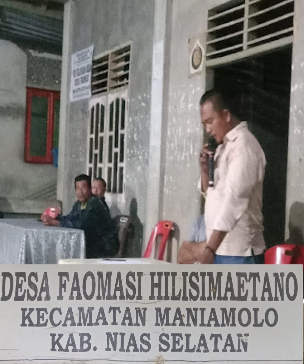 Lembaga Badan Permusyawaratan Desa (BPD) Faomasi Hilisimaetano, Kecamatan Maniamolo, Kabupaten Nias Selatan, pada Senin, 1 Desember 2025, melaksanakan musyawarah desa terbuka yang melibatkan seluruh lapisan masyarakat. Kegiatan tersebut digelar di Balai Desa Faomasi Hilisimaetano dan berjalan secara transparan serta penuh partisipasi warga.