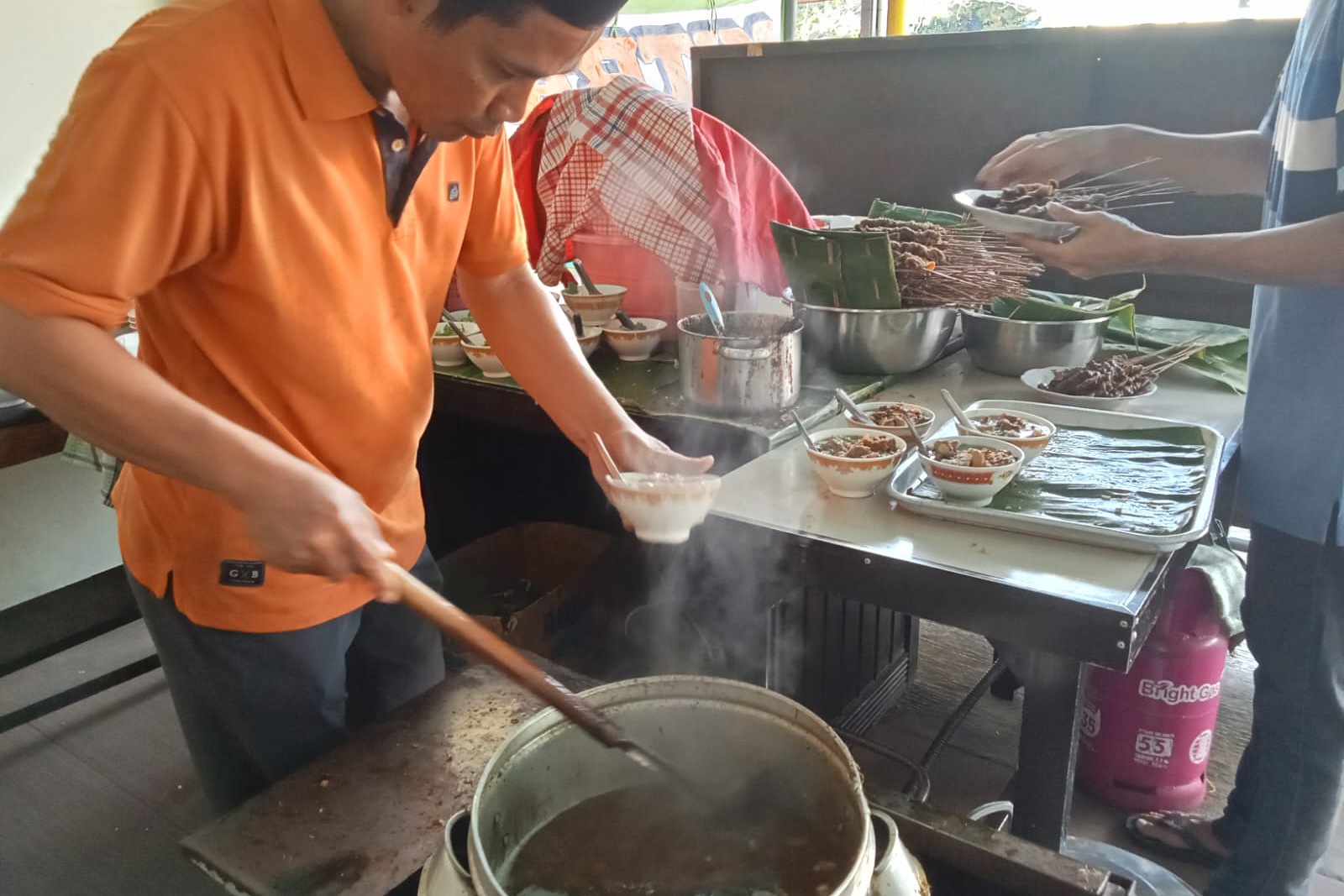 Untuk rasa yang lebih nikmat, jangan lupa menambahkan sedikit kecap yang sudah disediakan di atas meja dengan pelengkapnya sate kerbau. Meski disebut sebagai sate kerbau, tapi penyajiannya tidak tampak dibakar seperti sate pada umumnya. Hanya saja setelah daging dibumbui dan diungkep kemudian ditusuk seperti sate. Dalam penyajiannya sate ini dibalut dengan bumbu kelapa sangrai parut yang pekat.