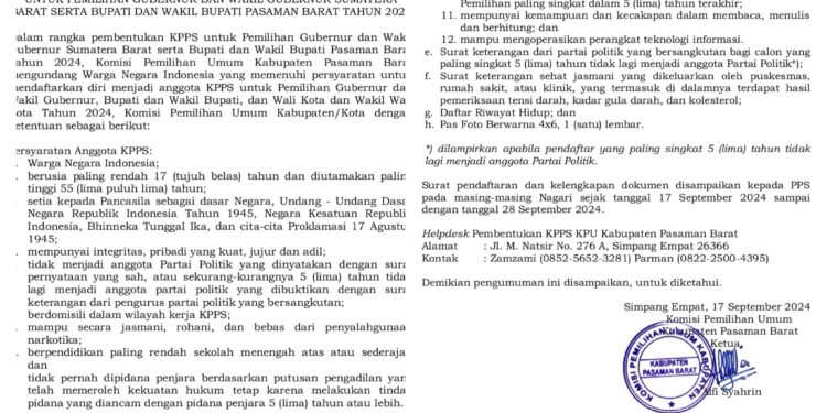 INformasinasional.com-Pasaman Barat-lam rangka pembentukan KPPS untuk Pemilihan Gubernur dan Wakil Gubernur Sumatera Barat serta Bupati dan Wakil Bupati Pasaman Barat Tahun 2024, Komisi Pemilihan Umum Kabupaten Pasaman Barat mengundang Warga Negara Indonesia yang memenuhi persyaratan untuk mendaftarkan diri menjadi anggota KPPS untuk Pemilihan Gubernur dan Wakil Gubernur, Bupati dan Wakil Bupati, dan Wali Kota dan Wakil Wali Kota Tahun 2024, Komisi Pemilihan Umum Kabupaten/Kota dengan ketentuan sebagai berikut: