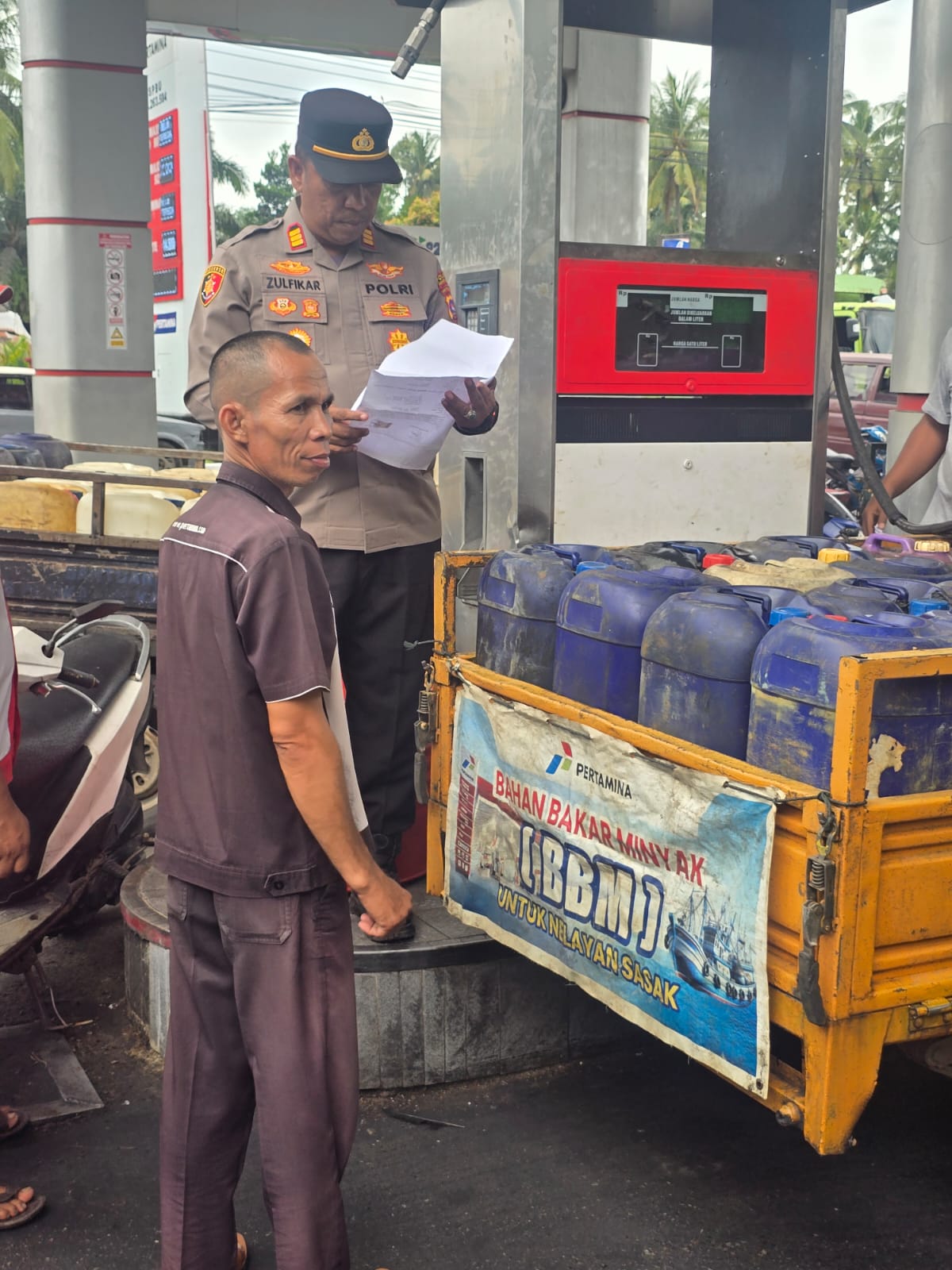 Petugas melakukan pengecekan terhadap pembelian BBM bagi nelayan dengan melihat keabsahan dan masa berlaku surat rekomendasi yang dikeluarkan secara resmi oleh instansi terkait.